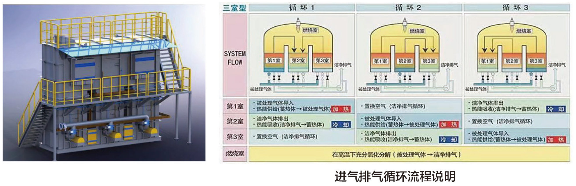 環(huán)中已被冷卻),放熱降溫后排出,而蓄熱室2吸收大量熱量后升溫(用于下一個(gè)循環(huán)加熱廢氣)。凈化后的廢氣經(jīng)煙囪排入大氣,同時(shí)引小股凈化氣清掃蓄熱室3。排氣溫度比進(jìn)氣溫度高約40℃左右。