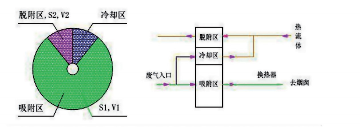 沸石濃縮轉(zhuǎn)輪被分為吸附區(qū)、脫附區(qū)、冷卻區(qū)三個(gè)功能區(qū)。